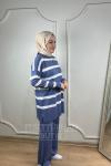 Rahatlık ve şıklığı bir araya getiren bu tesettür triko takım, günlük giyiminiz için mükemmel bir tercih. Üst kısmında yer alan yatay beyaz çizgiler, takıma modern bir hava katarken, bol paça pantolon ile rahat bir kullanım sunuyor. Yumuşak triko kumaşı sayesinde sonbahar ve kış aylarında tercih edebileceğiniz bu takım, zarif ve minimal tarzıyla gardırobunuzun favorilerinden olacak.
